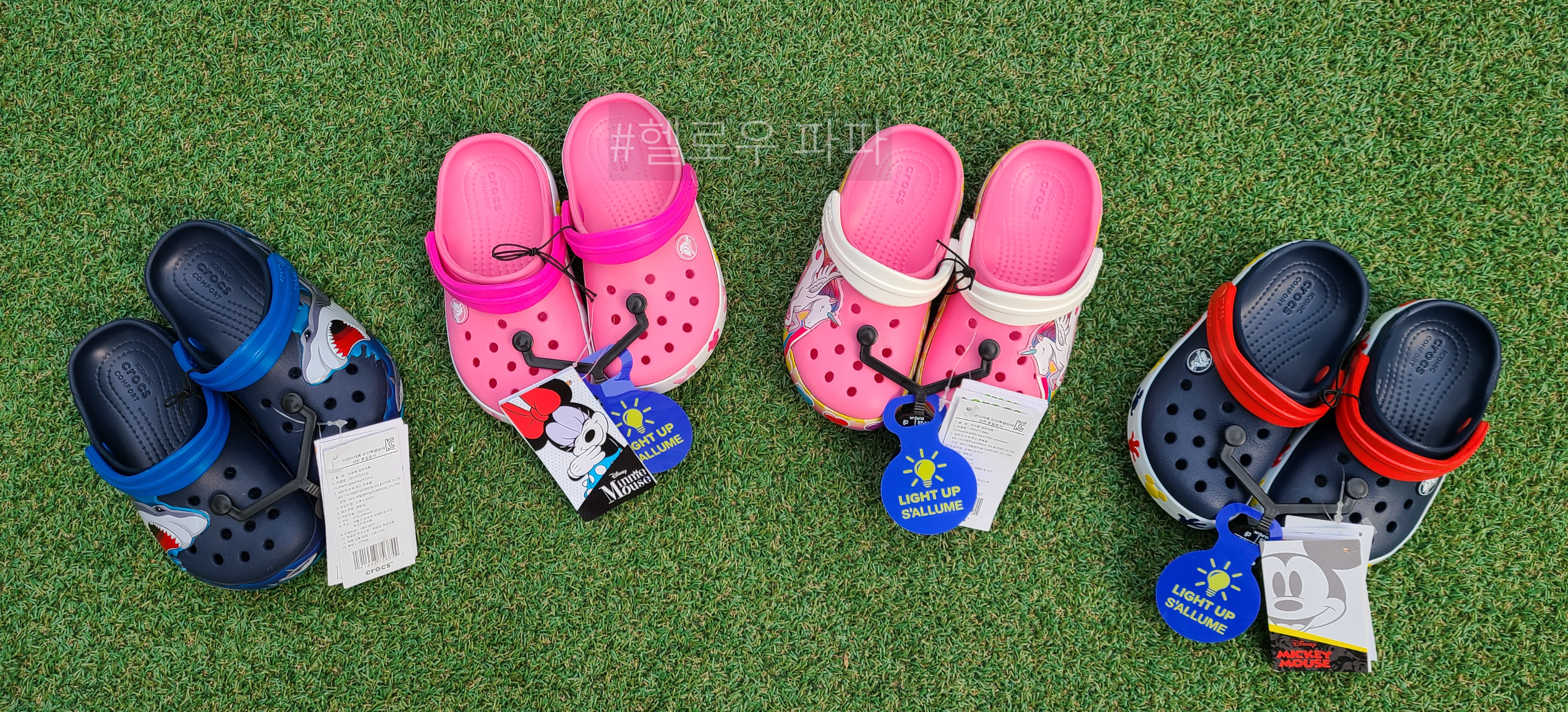 크록스 키즈 중에서 펀랩 라이트(미키, 미니, 유니콘, 샤크)의 경우 신발 아래 LED 라이팅이 걸을때마다 작동되어 아이들이 대표적으로 좋아하는 신발입니다.