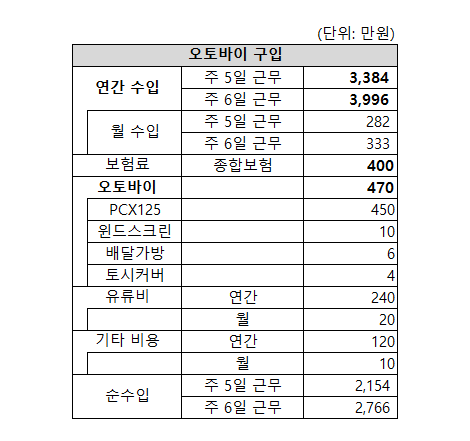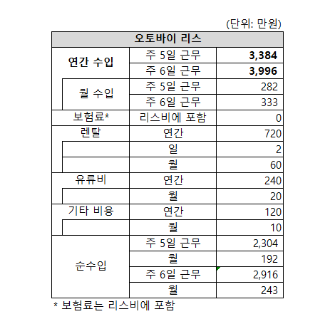 아래 표를 통해 연간 라이더의 수액 금액을 살펴보면, 주 5일 혹은 주 6일 근무에 따라 유류비 및 기타 비용도 차이가 발생하며 이들 비용을 차감한 순수입 금액도 물론 다르겠지만, 평균적으로 배달대행을 통한 순수입 금액은 연간 2,500~3,000만원을, 월 수입으로 200~250만원을 벌게 됩니다.