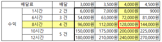 시간당 배달 4건이 넘어가면 교통신호 위반은 기본이고 과속은 필수.. 그만큼 교통사고 위험도 증가합니다. 또한, 운행 중 휴식, 식사 시간 등을 고려하면 8시간을 수입으로 계산 시 사실상 10시간 근무로 보시면 됩니다.