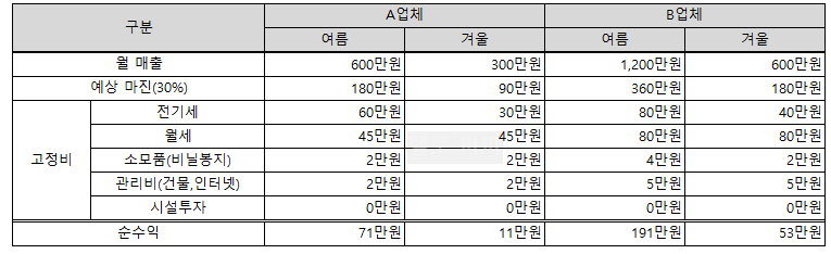 평범한 동네의 아이스크림 할인점 A점의 겨울철 일 매출은 평균 10만원, 월 300만원 내외 입니다. 여름 매출은 단순 2배 매출을 가정하였을 때 계절별 예상 월 순수익은 여름 71만원, 겨울 11만원으로 계절별 변동성이 매우 큰걸 확인 할 수 있습니다. 계절 변동성을 줄이기 위해서는 과자, 주스 등 아이스크림 외에 다양한 상품을 판매함으로써 매출을 극대화 하는것이 중요합니다. B점의 경우는 상권이 좋고 매출이 잘 나온다고 가정하였을 때 예상 매출, 순수익으로 단순 참고하시면 좋을거 같습니다.