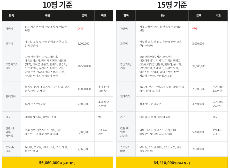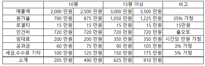 다만, 브랜드 관리 및 가치 제고 측면에서 목이 안좋거나 소형 평수인 경우 신규 창업이 어려울 수 있어서 A급 이상의 입지에 창업을 한다면 최소 보증금 1억원 이상, 월세 400~600만원, 권리금 1억원~1.5억원 등 매장 부지 마련에만 2.5억원 이상의 자금이 필요할 것으로 예상합니다.