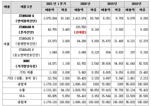 이후 '20년 COVID-19 염기서열 공개 이후 6주 만에 STANDARD M (분자진단) RT-PCT 제품을 출시하여 질병관리청으로부터 긴급사용승인 획득하였고, 2020년 기준 COVID-19 신속진단키트 브랜드인 STANDARD Q 매출(비중) 1.4조원(84%)으로 타 제품 대비 압도적인 판매량을 기록하였습니다.
