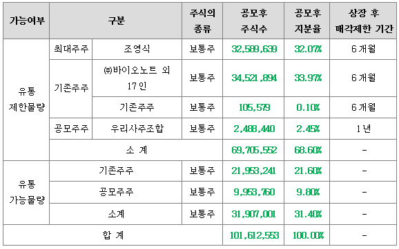 상장 후 유통가능 주식수 비중 31%로 기존 주주들의 구주매출 비중이 21.6%, 신규 모집(공모) 비중 9.8%이며, 최대주주 및 기존 주주들의 Lockup 기간 6개월(우리사주 1년). 행사되지 않은 주식매선택권 1,206,000주(행사기간 '22.10.30~'23.10.29)로 공모 후 주식수의 1.2% 비중으로 높지 않은 편입니다.