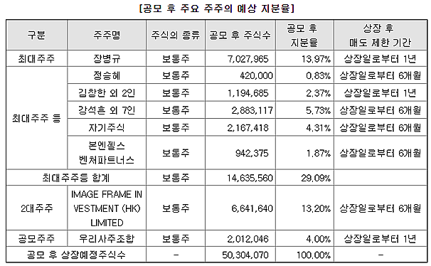 상장 전 지분구조는 최대주주 및 특수관계인의 보유 지분 합계 36.4%로 이 중 최대주주 본인은 16.4% 보유. 그 외 텐센트 자회사 Image Frame Investment (HK)이 15.4%를 보유.