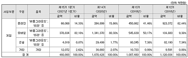 매출에 90% 이상이 해외 특히 중국(텐센트 추정)에서 발생하고 있습니다. ('21.1분기 기준 해외매출 비중 94.3%) 코로나19 영향으로 게임 사용자가 많아지며 '20년 매출액은 1.67조원으로 전년동기 1.08조원 대비 +54.6% 증가하였죠. 이미 매출 대부분이 모바일에서 발생(82%)하고 있습니다.
